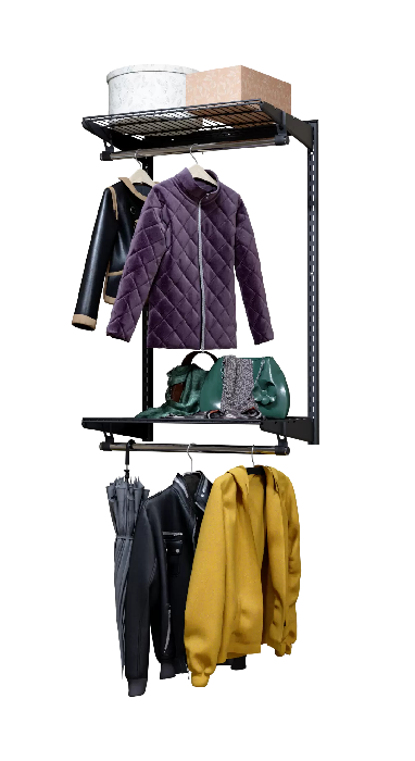 Гардеробные системы Титан GS удобное, функциональное и мобильное решение для хранения вещей в различных помещениях. Система собирается в разных комплектациях, что позволяет подстраивать ее под размеры помещения и ориентироваться на личные пожелания по расположению отдельных элементов.