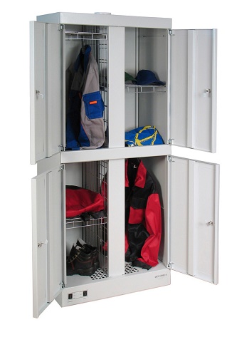 Шкаф сушильный ШСО-2000-4 предназначен для сушки мокрой и влажной одежды и обуви. В шкаф установлены съемные сетчатые полки, фланец для подсоединения к вытяжке, ключевой замок для каждого отделения. Характеристика шкафа: питание 220В/50 Гц, потребляемая мощность электро-двигателя 60Вт, нагреваемый элемент 2000 Вт, уровень шума не более 55 дБ, производительность вентилятора 360 м3/ч, Длина шнура электропитания 2,5 м, есть защита от перегрева, таймер на 4 часа работы или на бесконечную работу. Цвет серый (RAL 7038)