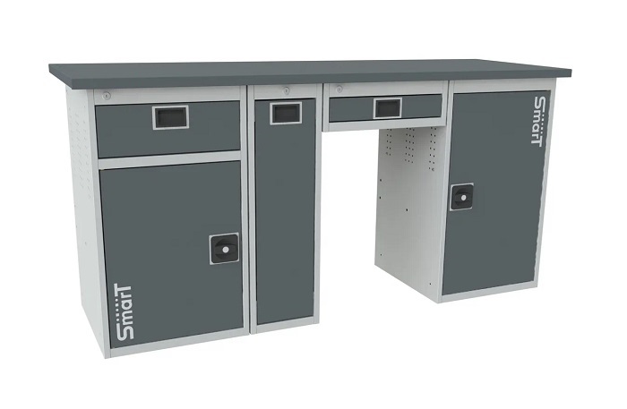 Промышленная мебель SMART предназначена для использования на легких производствах, в гаражах и мастерских. Представляет собой сборно-разборную конструкцию. Выдерживает равномерно распределенную нагрузку 300 кг на верстак и 30 кг на полку. Все элементы изготовлены из высококачественной стали и учитывают структуру расположения волокон металла, что позволяет уменьшить толщину применяемого металла и уменьшает вес изделия с сохранением несущих нагрузок. Слесарный верстак SMART 1760-1-1-Р-У-1 состоит из Столешницы 1760 SMART, Тумбы-пенала SMART, Ящик подвесной SMART-1, Тумбы SMART-2, Тумбы SMART-1. Тумбы комплектуются выдвижным ящиком с телескопическими направляющими, Полкой, Дверьми, которые закрываются на единый цилиндрический замок, квадратной и круглой Перфорациеей. Тумба-пенал позволяет размещать крупногаборитные инструменты и акссесуары. Дверцы тумб имеют возможность смены стороны открывания. Верстак окрашен порошковой краской, устойчивой к механическим воздействиям и агрессивным жидкостям. Цвет темно-серый (RAL 7016)+светло-серый (RAL7035). Поставляется в разобранном виде. Дополнительные комплектующие- экран, комплект освещения, антискользящий коврик, перегородка, ящик-органайзер, навески под все типы ручного инструмента, урна, крепление для монитора, держатель полотенец
